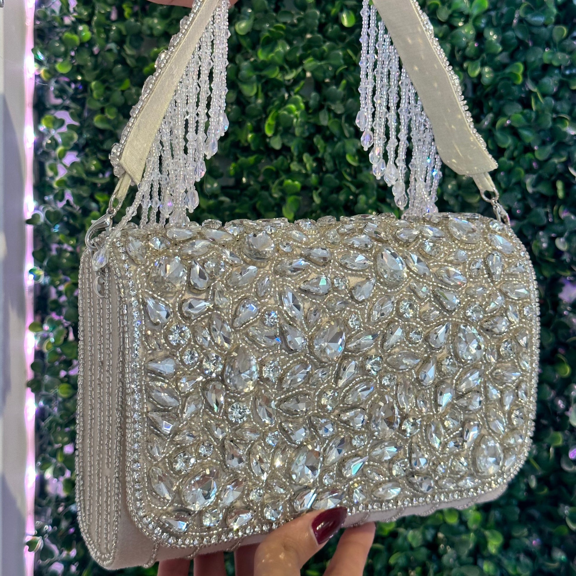 Introducing our Crystal Cascade clutch bag adorned with Diamantes and Crystals. A stunning accessory that will elevate your elegance and sophistication to new heights. Crafted with meticulous attention to detail, this clutch bag is the epitome of glamour and luxury.