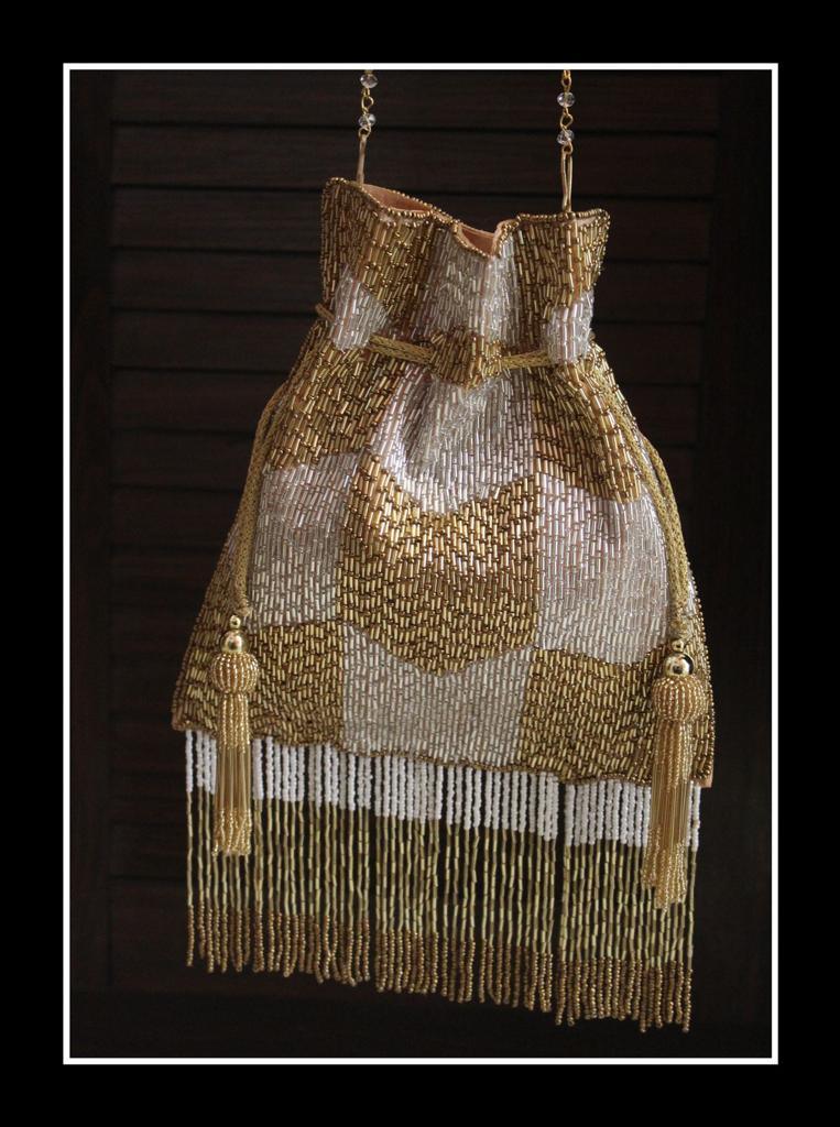 A luxurious detailed bead potli bag hand crafted with fine details. The extra long tassels for the luxurious look with metal chain and wristlet elevates her beauty as well as reflecting her delicacy.