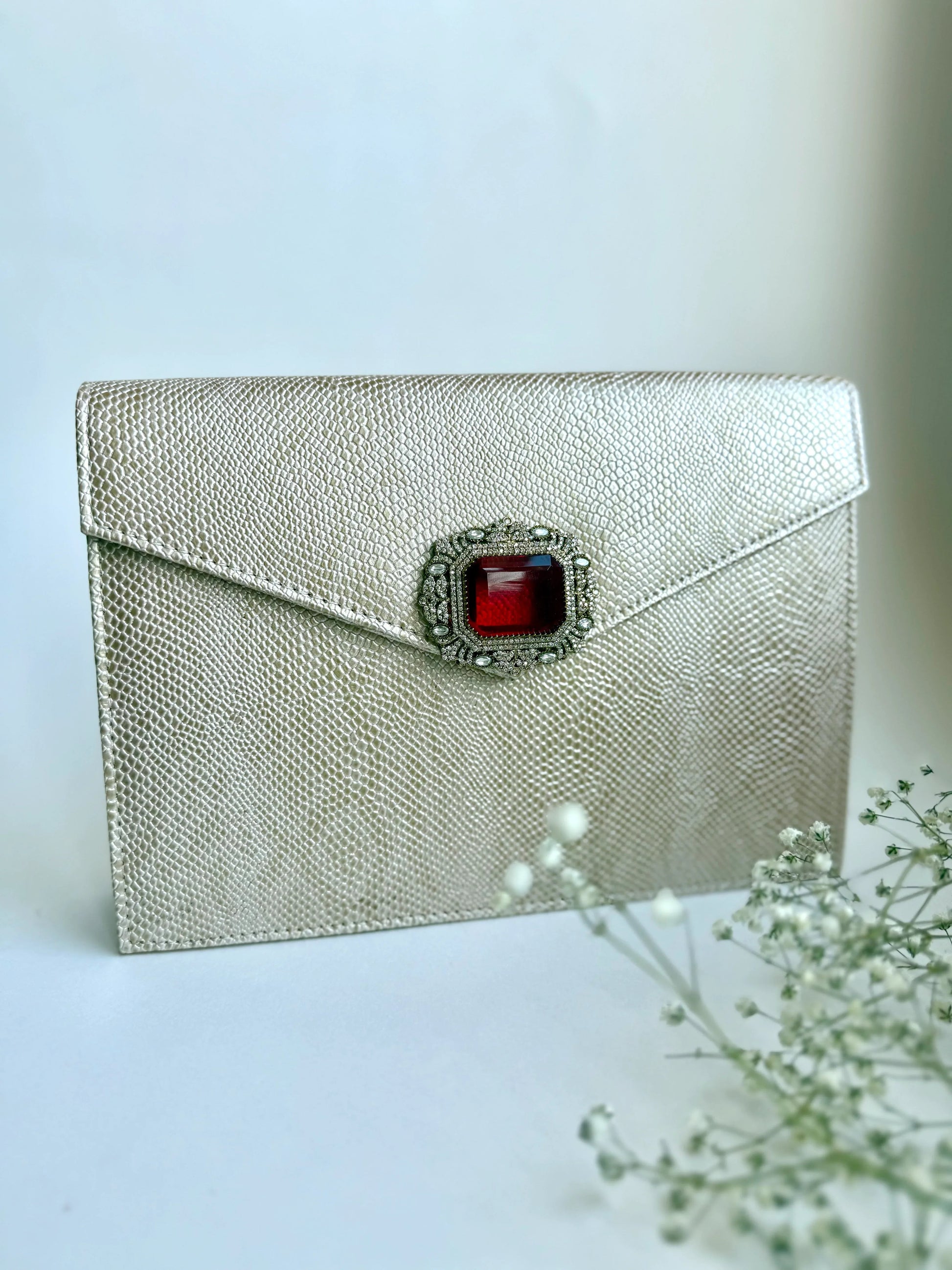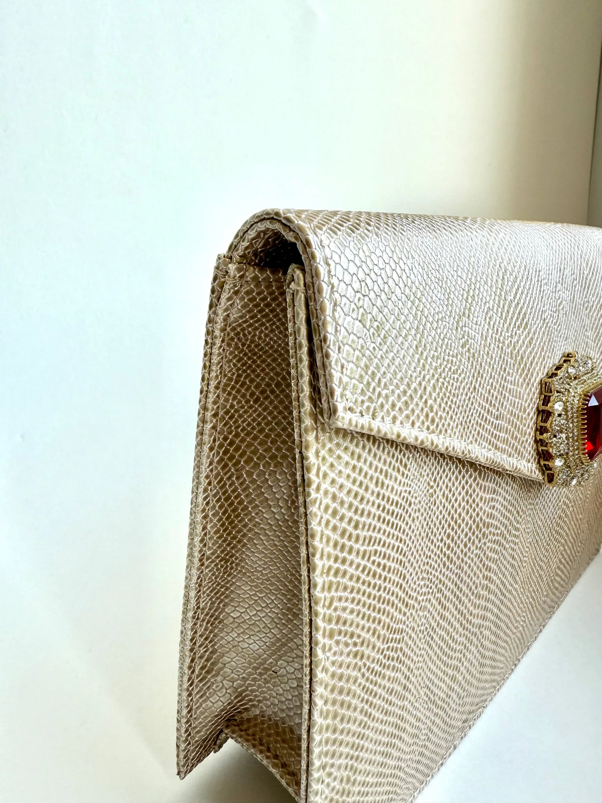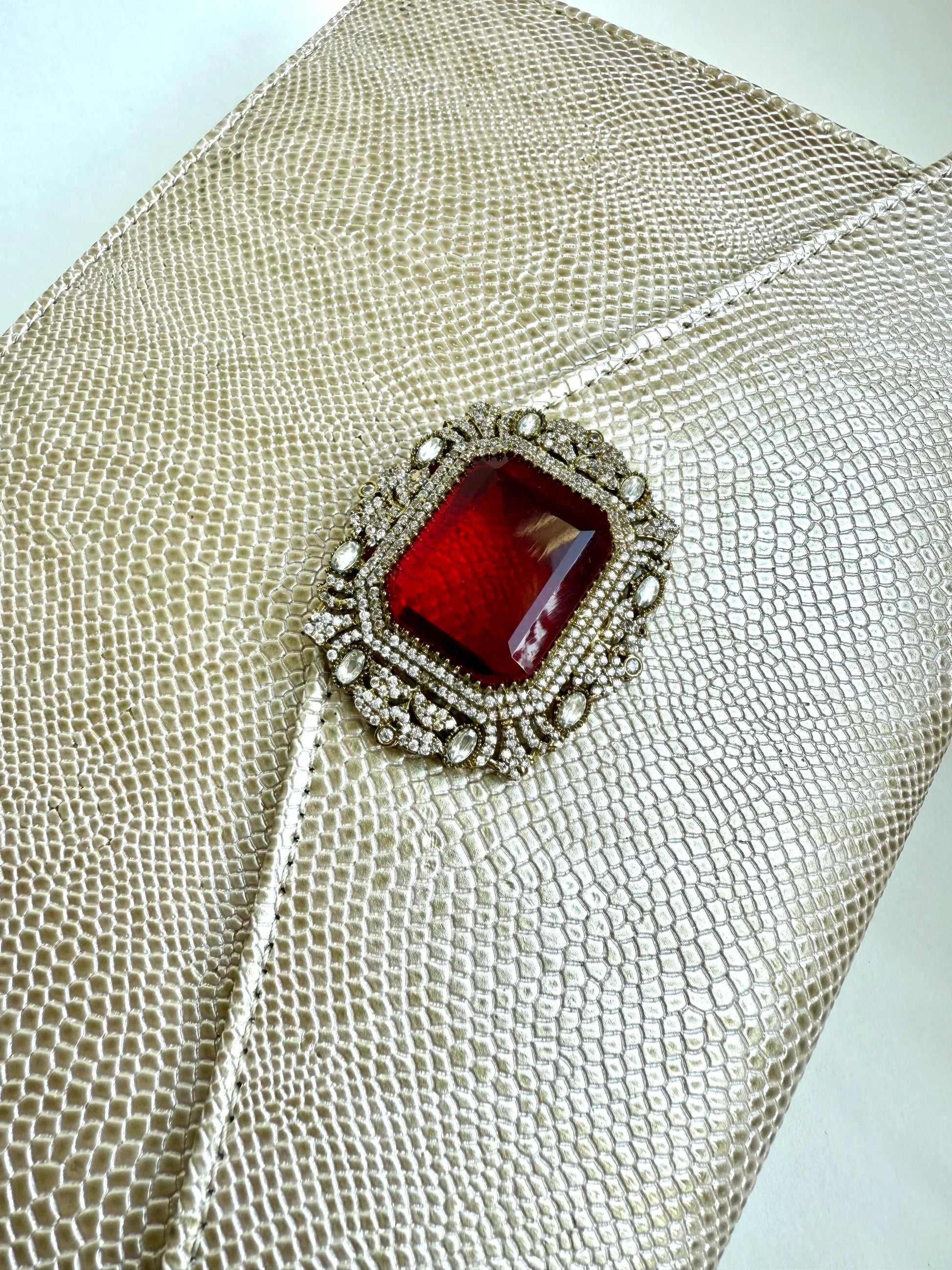 Designed for effortless luxury, The Royale Clutch features a stunning gold-toned, lizard-embossed exterior that exudes sophistication. The structured envelope silhouette is adorned with a striking red gemstone clasp, framed by antique silver embellishments for a regal touch. Crafted from high-quality vegan leather, this clutch is lined with soft satin and includes a secure magnetic closure. A detachable chain strap adds versatility, allowing it to be styled as a shoulder bag or a classic handheld clutch—perfect for evening soirées and special occasions.
