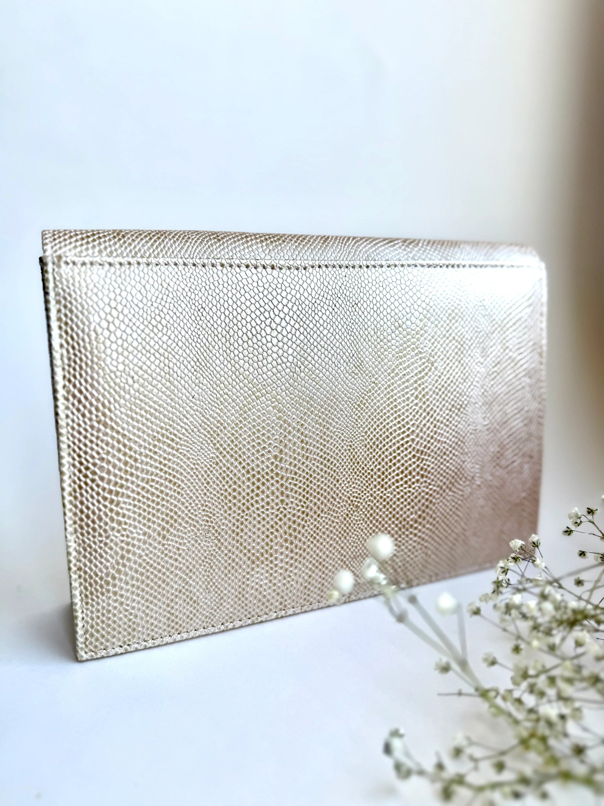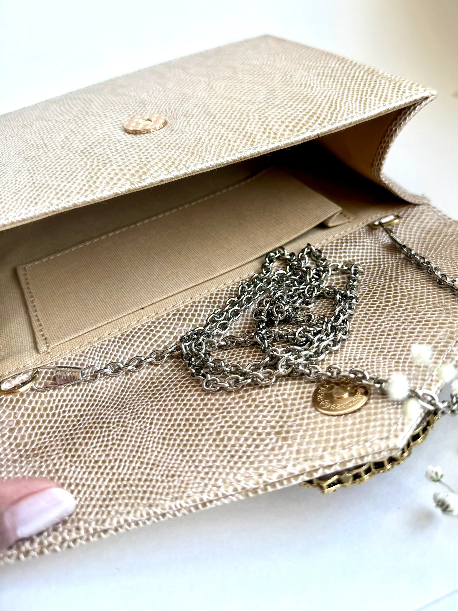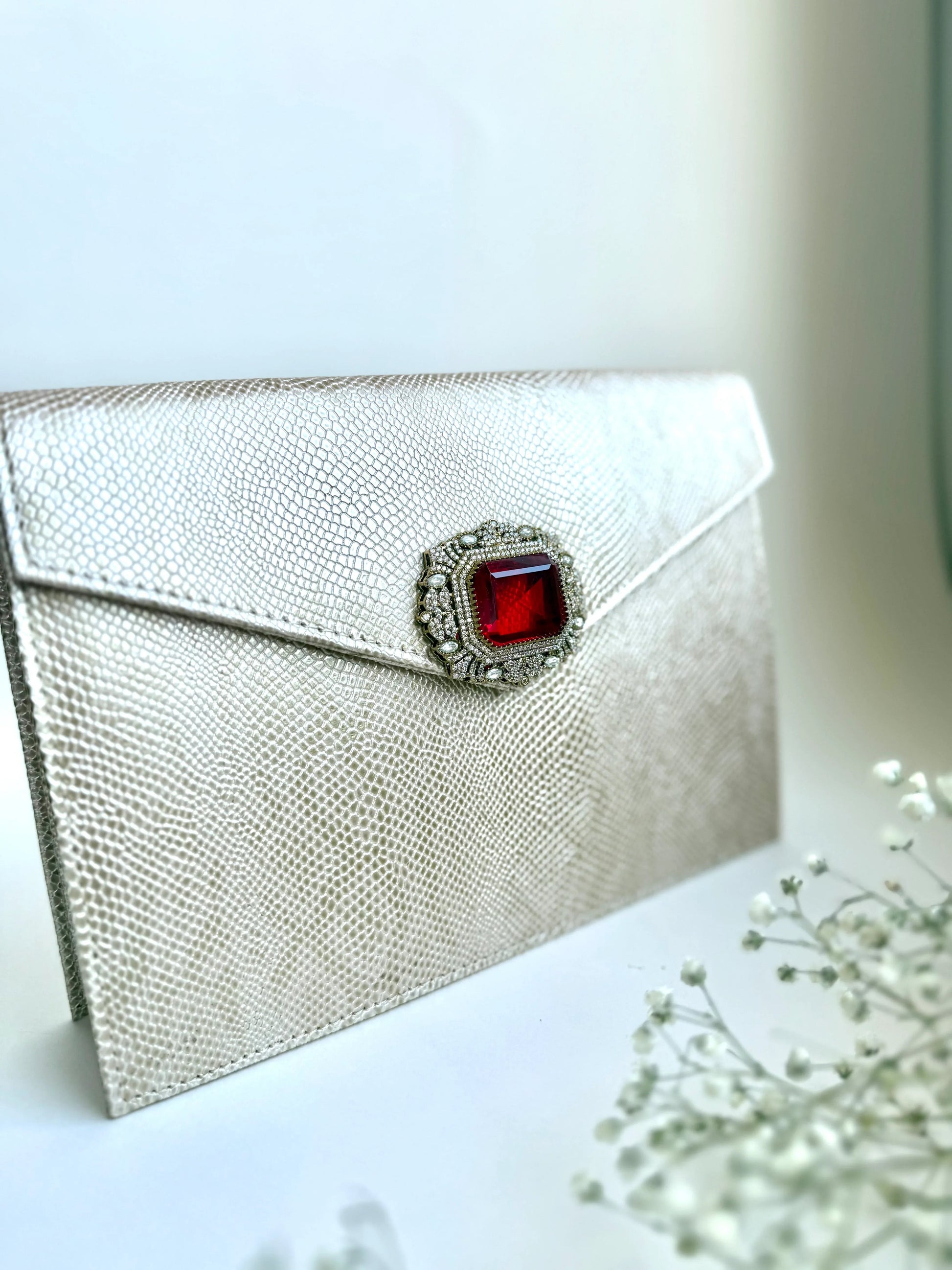 Designed for effortless luxury, The Royale Clutch features a stunning gold-toned, lizard-embossed exterior that exudes sophistication. The structured envelope silhouette is adorned with a striking red gemstone clasp, framed by antique silver embellishments for a regal touch. Crafted from high-quality vegan leather, this clutch is lined with soft satin and includes a secure magnetic closure. A detachable chain strap adds versatility, allowing it to be styled as a shoulder bag or a classic handheld clutch—perfect for evening soirées and special occasions.